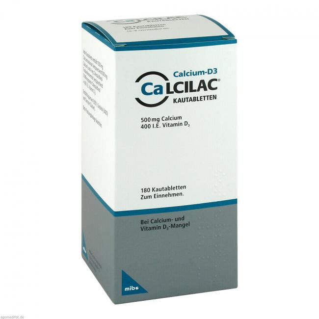 Calcilac sind Kautabletten, die Calcium und Vitamin D3 enthalten - zwei wichtige Substanzen für den Knochenaufbau. Calcilac Kautabletten 500 mg/400 I.E. werden eingenommen zur Vorbeugung und Behandlung von Calcium- und Vitamin-D-Mangelzuständen bei älteren Menschen und als Ergänzung zur Unterstützung einer spezifischen Osteoporosetherapie für Patienten, bei denen das Risiko eines Vitamin-D- und Calciummangels besteht. Wenn Sie sich nach einem Monat nicht besser oder gar schlechter fühlen, wenden Sie sich an Ihren Arzt.