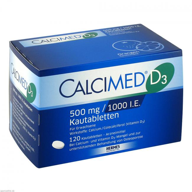 Calcimed D3 500 mg/1000 I.E. Kautabletten. Anwendungsgebiete: zur Prophylaxe und Behandlung von Calcium- und Vitamin D-Mangelzuständen bei älteren Menschen und als Calcium- und Vitamin D-Ergänzung zur unterstützenden Behandlung der Osteoporose (Knochenschwund).