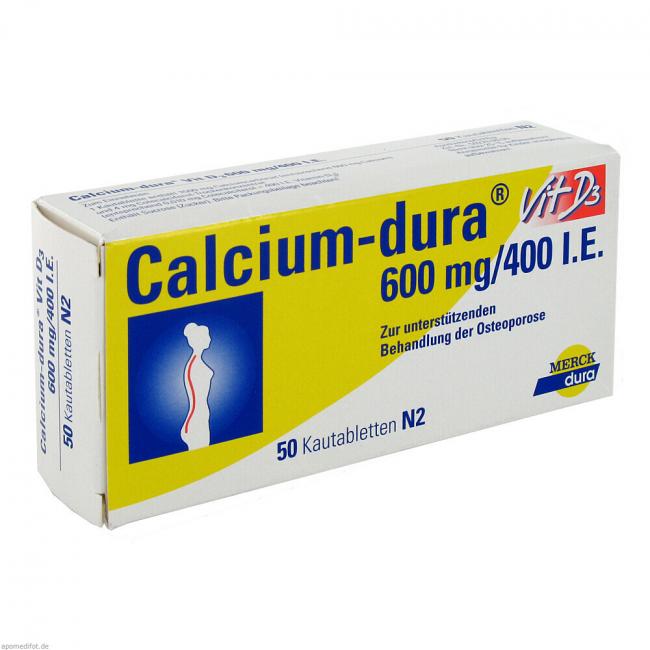 Calcium-dura Vit D3 600 mg/400 I.E. Kautabletten. Anwendungsgebiete: zum Ausgleich kombinierter Vitamin-D- und Calciummangelzustände bei älteren Patienten und zur Vitamin-D- und Calcium-Ergänzung als Zusatz zu einer spezifischen Osteoporosebehandlung von Patienten, bei denen ein kombinierter Vitamin-D- und Calciummangel festgestellt wurde oder bei denen ein hohes Risiko für solche Mangelzustände besteht.