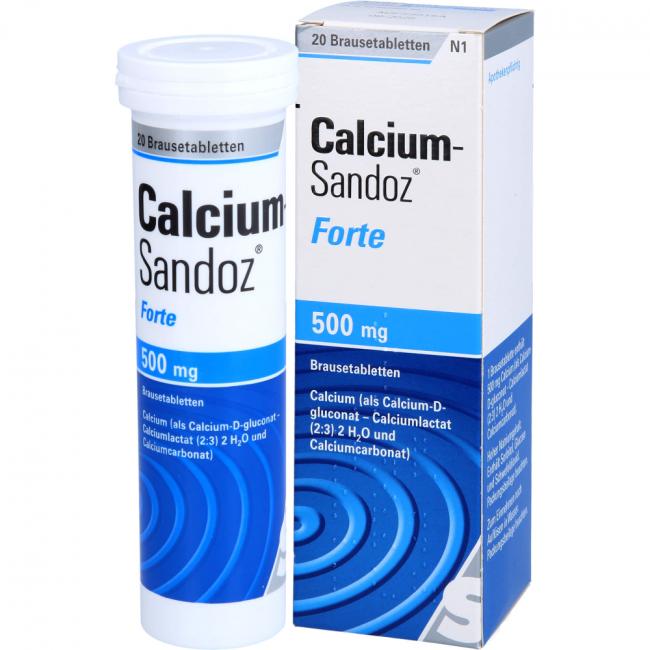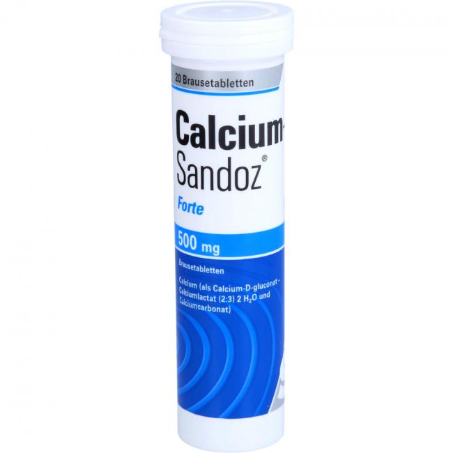 Calcium-Sandoz Forte 500 mg sind weiße, runde, flache Brausetabletten mit abgeschrägter Kante und Orangengeruch. Die Brausetabletten sind in Polypropylenröhrchen mit einem Polyethylenstopfen, welcher mit Silicagel als Trockenmittel gefüllt ist, verpackt. Calcium-Sandoz Forte 500 mg ist in Packungen mit 20, 40 und 100 Brausetabletten und Klinikpackungen mit 600 Brausetabletten erhältlich. Es werden möglicherweise nicht alle Packungsgrößen in den Verkehr gebracht.