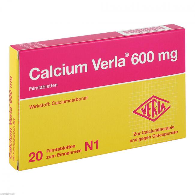 Calcium Verla 600 mg Filmtabletten. Wirkstoff: Calciumcarbonat. Anwendungsgebiete: zur Vorbeugung eines Calciummangels bei erhöhtem Bedarf (z.B. Wachstumsalter, Schwangerschaft, Stillzeit)und zur unterstützenden Behandlung der Osteoporose.