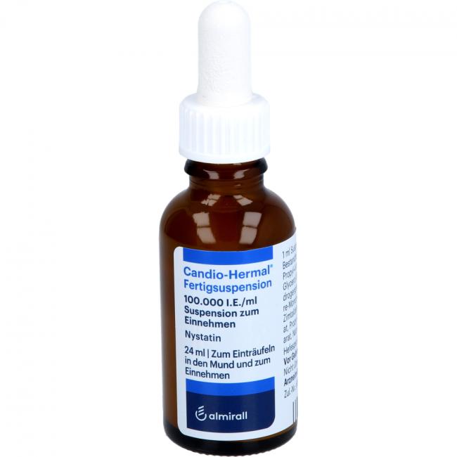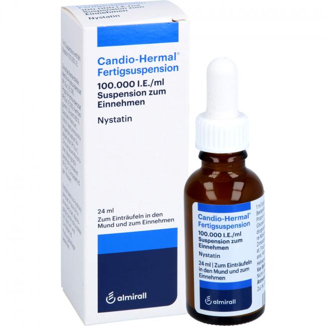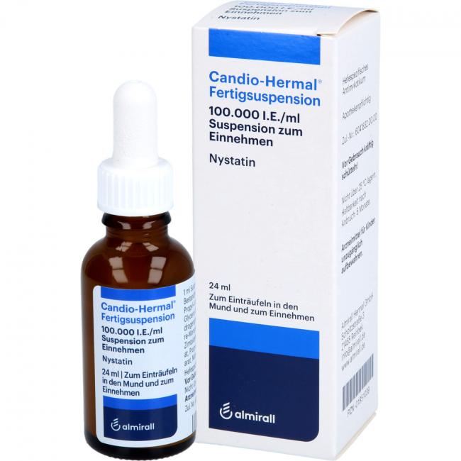 Candio-Hermal Fertigsuspension 100.000 I.E./ml. Wirkstoff: Nystatin. Anwendungsgebiete: zur topischen Behandlung nystatinempfindlicher Hefepilzinfektionen im Oro-Gastro-Intestinaltrakt.