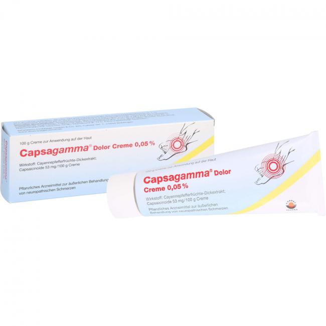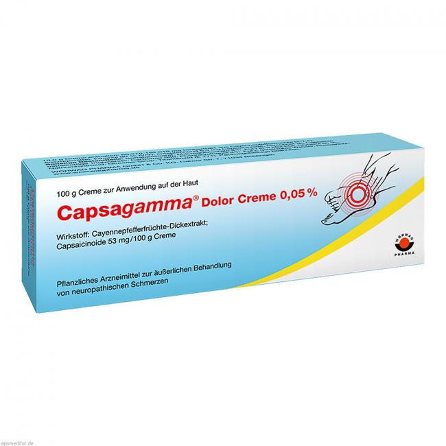 Capsagamma Dolor Creme 0,05%. Wirkstoff: Cayennepfefferfrüchte-Dickextrakt. Anwendungsgebiet: zur Linderung von leichten Fuß-/Unterschenkelschmerzen auf Grund von chronisch-schmerzhafter diabetischer Nervenschädigung (Polyneuropathie). Die Behandlung mit diesem Arzneimittel ist nur sinnvoll im Rahmen eines therapeutischen Gesamtkonzeptes. Es bessert nicht die Nervenschädigung selbst.