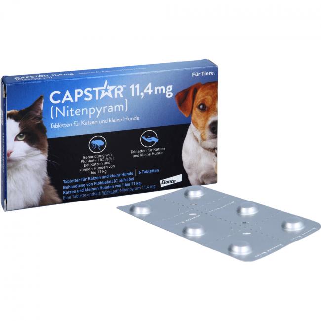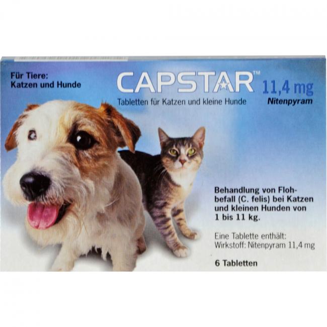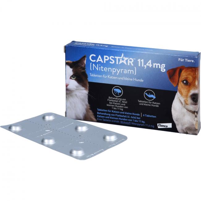 Capstar 11,4 mg, Tabletten. Wirkstoff: Nitenpyram. Anwendungsgebiete: Behandlung von Flohbefall (C. felis) bei Katzen und Hunden.