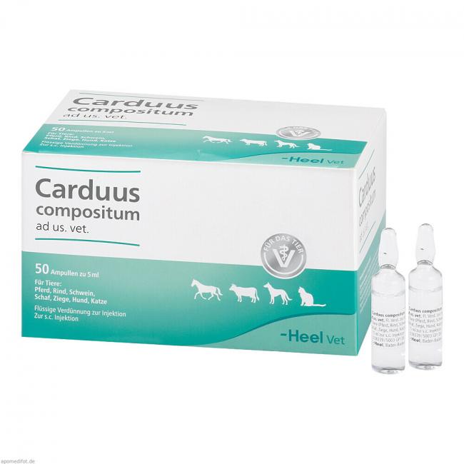 Carduus compositum ad us. vet., Flüssige Verdünnung zur Injektion. Wirkstoffe: Silybum marianum Dil. D1, Chelidonium majus Dil. D3, Cinchona pubescens Dil. D2, Citrullus colocynthis Dil. D5, Lycopodium clavatum Dil. D2, Myristica fragrans Dil. D3, Veratrum album Dil. D5, Phosphorus Dil. D5. Anwendungsgebiete: Registriertes homöopathisches Arzneimittel, daher ohne Angabe einer therapeutischen Indikation.