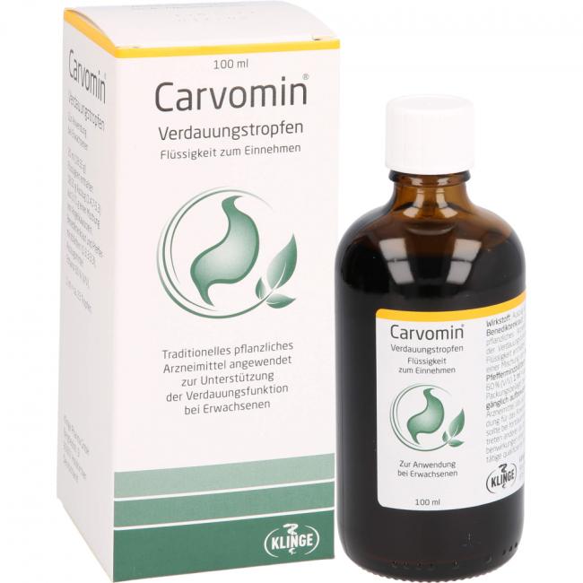 Carvomin Verdauungstropfen, Flüssigkeit. Wirkstoff: Auszug aus einer Mischung von Angelikawurzeln, Benediktenkraut und Pfefferminzblättern. Anwendungsgebiete: traditionelles pflanzliches Arzneimittel zur Unterstützung der Verdauungsfunktion bei Erwachsenen. Warnhinweis: Enthält 58 Vol.-% Alkohol!
