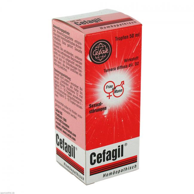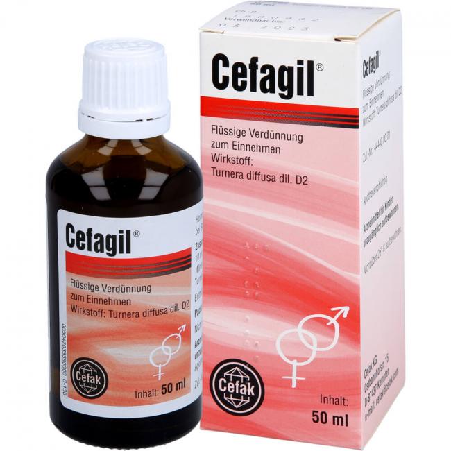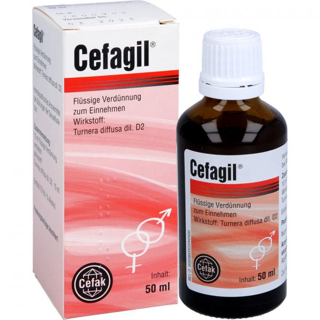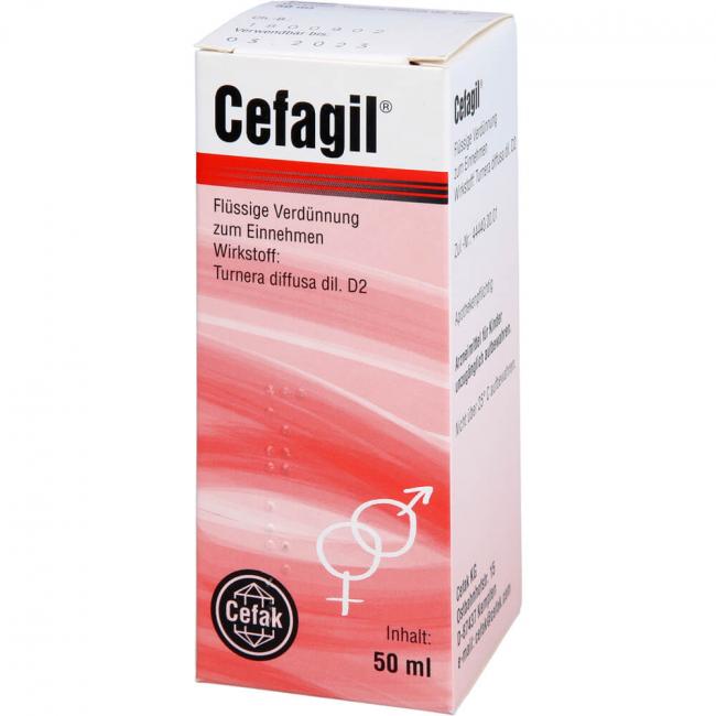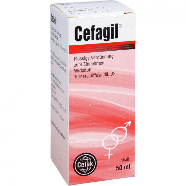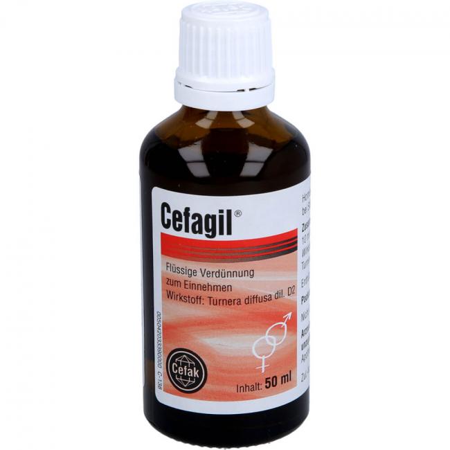Cefagil bei Störungen der Sexualfunktion - flüssige Verdünnung zum Einnehmen, Tropfen 50 ml. Wirkstoff: Turnera diffusa dil. D2. Anwendungsgebiete: bei sexueller Schwäche.Warnhinweis: Enthält 70 % vol. Alkohol.