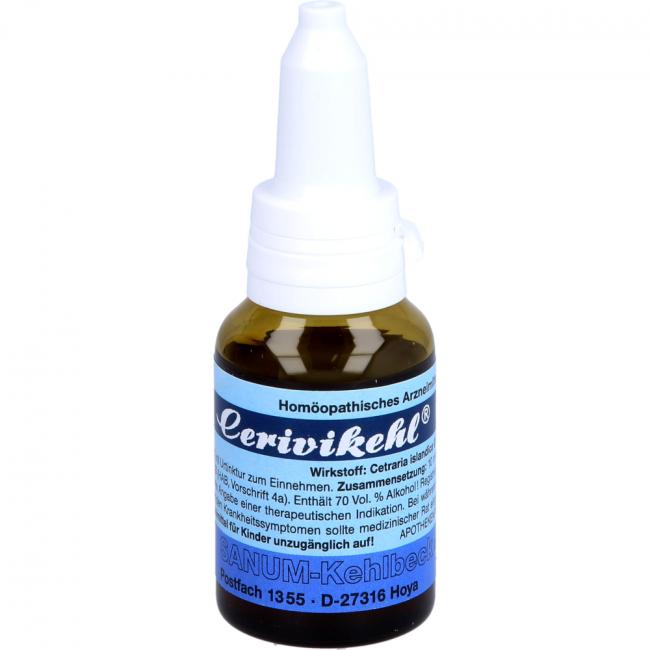 Cerivikehl Urtinktur. Wirkstoff: Cetraria islandica Ø. Anwendungsgebiete: Registriertes homöopathisches Arzneimittel, daher ohne Angabe einer therapeutischen Indikation. Warnhinweis: Enthält 70 Vol.-% Alkohol!