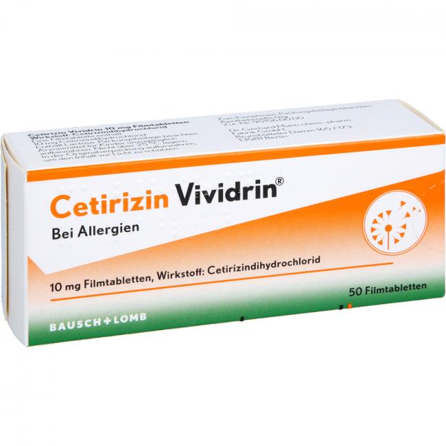 Wirkstoff: Cetirizindihydrochlorid. Anwendungsgebiete: Cetirizin Vividrin ist ein Antiallergikum und angezeigt zur Linderung von Nasen- und Augensymptomen bei saisonaler und ganzjähriger allergischer Rhinitis sowie zur Linderung von Urtikaria (Nesselsucht) bei Erwachsenen und Kindern ab 6 Jahren. Warnhinweis: Enthält Lactose.