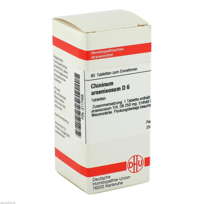 Chininum Arsenicosum D 6. Anwendungsgebiete: Registriertes homöopathisches Arzneimittel daher ohne Angabe einer therapeutischen Indikation. Warnhinweis: Enthält Lactose (Milchzucker) und Weizenstärke.