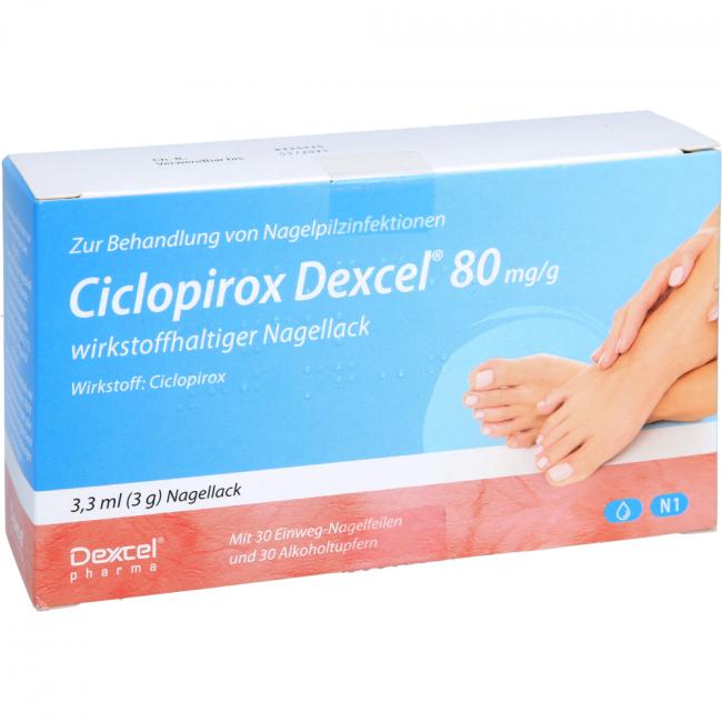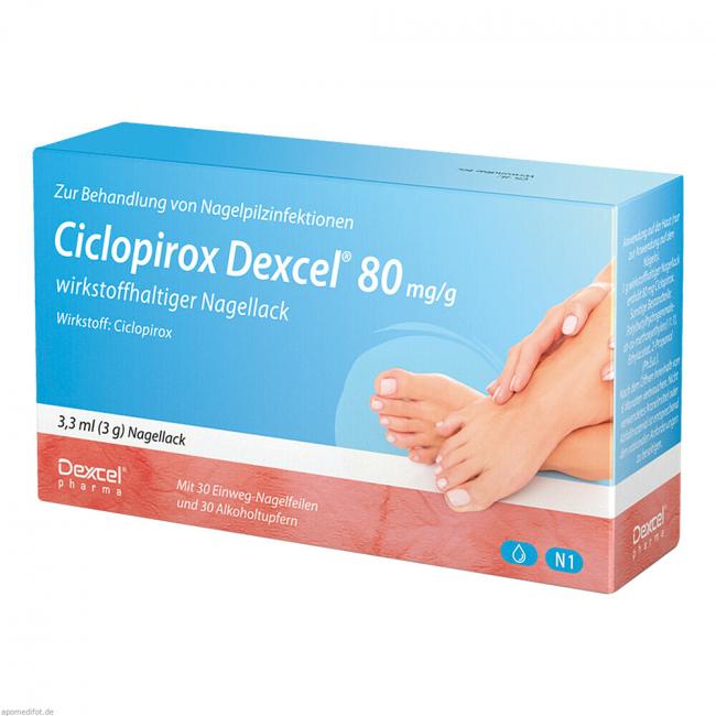 Ciclopirox, 1 g Ciclopirox Dexcel 80 mg/g wirkstoffhaltiger Nagellack enthält 80 mg Ciclopirox.