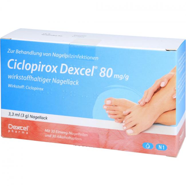 Ciclopirox Dexcel ist ein wirkstoffhaltiger Nagellack. Es enthält den Wirkstoff Ciclopirox, der zu einer Arzneimittelgruppe namens Antimykotika gehört. Ciclopirox durchdringt die Nagelplatte und übt eine pilztötende Wirkung auf alle wichtigen Verursacher von Nagelpilzerkrankungen aus.