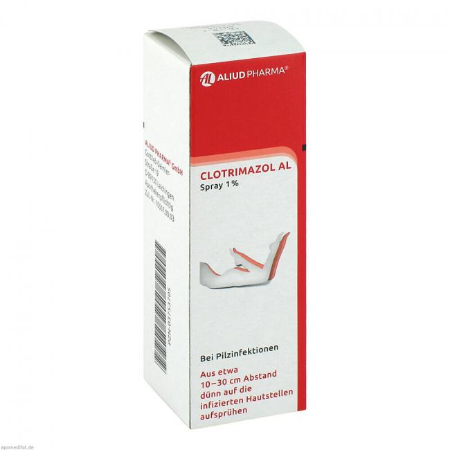 Clotrimazol AL Spray 1%. Anwendungsgebiete: bei Pilzinfektionen der Haut durch Dermatophyten, Hefen (z.B. Candida-Arten), Schimmelpilze und andere, wie Malassezia furfur sowie Infektionen durch Corynebakterium minutissimum. Diese können sich äußern als Mykosen der Füße, Mykosen der Haut und der Hautfalten, Pityriasis versicolor, Erythrasma, oberflächliche Candidosen.