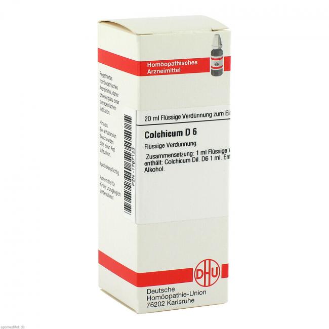 Colchicum D 6. Anwendungsgebiete: Registriertes homöopathisches Arzneimittel, daher ohne Angabe einer therapeutischen Indikation. Warnhinweis: Enthält 51 Vol.% Alkohol.