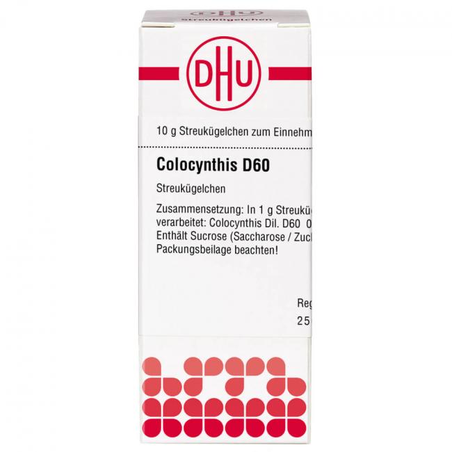 Colocynthis D 60. Anwendungsgebiete: Registriertes homöopathisches Arzneimittel, daher ohne Angabe einer therapeutischen Indikation. Warnhinweis: Dieses Arzneimittel enthält Sucrose (Saccharose / Zucker).