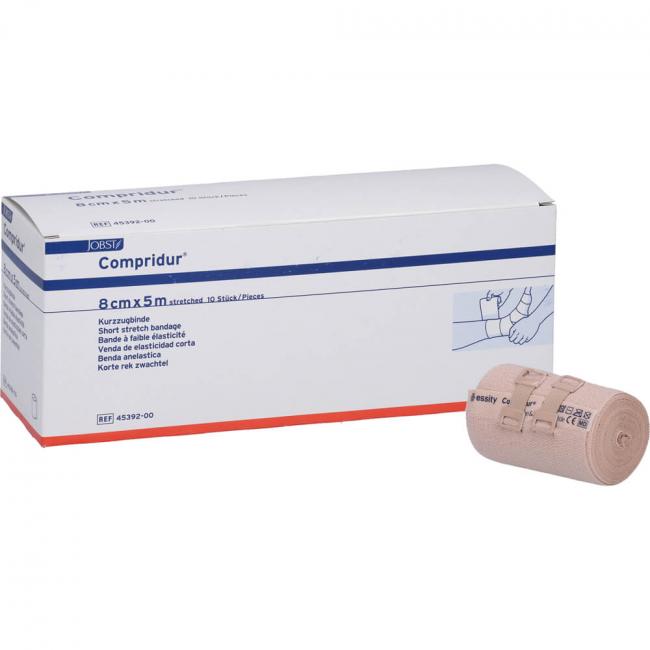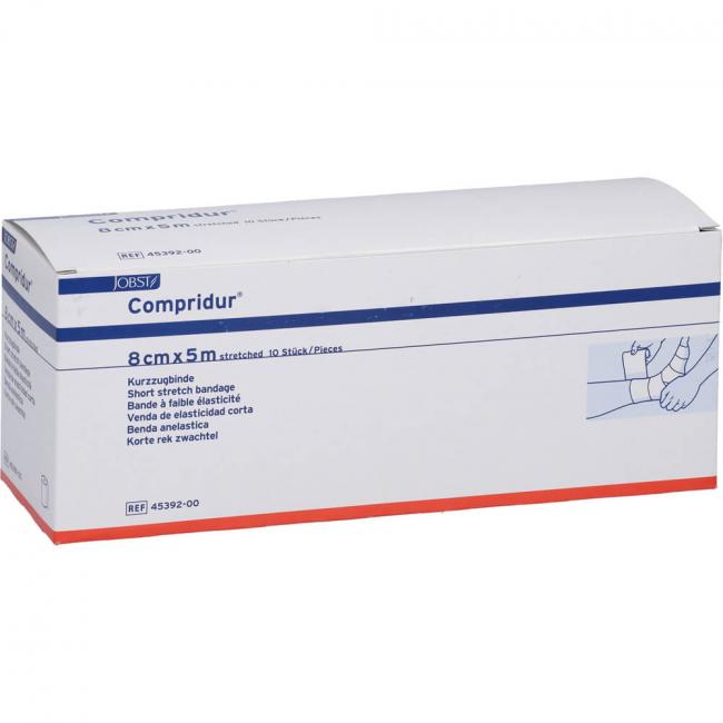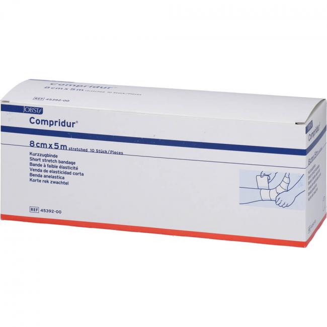 Ein Kompressionsverband soll das Entstehen einer venösen oder lymphatisch bedingten Schwellung verhindern, aber auch bestehende Ödeme reduzieren. Compridur verbindet die ideale Druckwirkung einer Kurzzugbinde (niedriger Ruhedruck bei hohem Arbeitsdruck) mit den Vorteilen der Dauerelastizität und zeichnet sich zudem durch hervorragende Trageeigenschaften aus. Compridur verfügt über ca. 50% Längsdehnung. Die Muskelpumpe wird aktiviert und unterstützt. Die Binde zeichnet sich durch eine lange Haltbarkeit und hohe Strapazierfähigkeit aus. Compridur besteht aus 78% Baumwolle, 22% Polyamid und ist mehrfach waschbar.