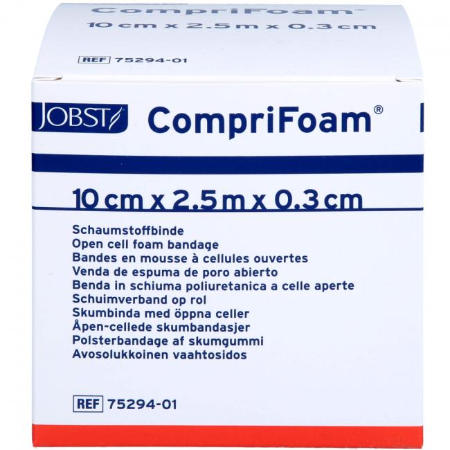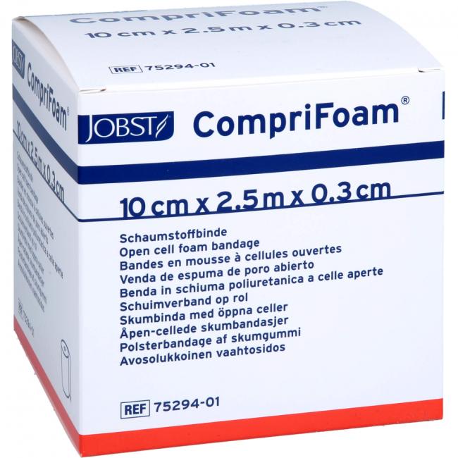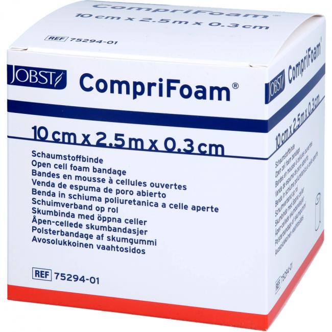 Die Schaumstoffbinde CompriFoam ist ideal zur Polsterung unter Kompressionsverbänden bei phlebologischen und lymphologischen Indikationen. CompriFoam wurde entwickelt, um den Druck gleichmäßig über die gesamte Extremität zu verteilen. Mit CompriFoam können Einschnürungen vermieden und die effektive Kompressionstherapie gesichert werden. Darüber hinaus ist CompriFoam auch als effektives Polstermaterial und synthetische Stützverbände zur orthopädischen Anwendung geeignet. Es ist atmungsaktiv, feuchtigkeitsdurchlässig und zudem dampfsterilisierbar und wiederverwendbar. Durch die anatomische Anpassungsfähigkeit bleibt eine gute Bewegungsfreiheit bestehen. CompriFoam besteht aus 100% Polyurethanschaum.