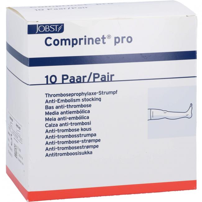 Die Häufigkeit tiefer Venenthrombosen und Lungenembolien verdeutlicht die Notwendigkeit der physikalischen Thromboseprophylaxe. Comprinet pro erfüllt alle wissenschaftlichen Ansprüche an einen anatomisch formgerechten Thromboseprophylaxe-Strumpf. Der Kompressionsdruck beträgt im Fesselbereich ca. 18 mmHg und fällt von distal nach proximal linear ab. Comprinet pro ist unter Berücksichtigung der speziellen Waschempfehlung bis zu 10-mal ohne Beeinträchtigung des Druckprofils waschbar. Er ist in zwei Längen und drei Weiten (Oberschenkelumfänge bis 86 cm) sowie zwei Sondergrößen (Oberschenkelumfänge bis 90 cm) und zusätzlich in Knielänge verfügbar. Comprinet pro ist nahtlos rundgestrickt. Der Strumpf ist mit einem Einnähetikett ausgestattet, auf dem die Größe waschfest aufgedruckt ist, und er verfügt zudem über einen individuellen Barcode sowie ein Musterfeld zur Dokumentation der Waschens. Eine einfache Größenerkennung wird durch die Farbkennzeichnung am Zehensichtfenster an der Fußoberseite ermöglicht. Comprinet pro Oberschenkellang besteht aus 77% Polyamid, 19% Elasthan, 4% Neopren und ist bis zu 10-mal wiederaufbereitbar. Comprinet pro Knielang besteht aus 80% Polyamid sowie 20% Elasthan und ist ebenfalls bis zu 10-mal wiederaufbereitbar.