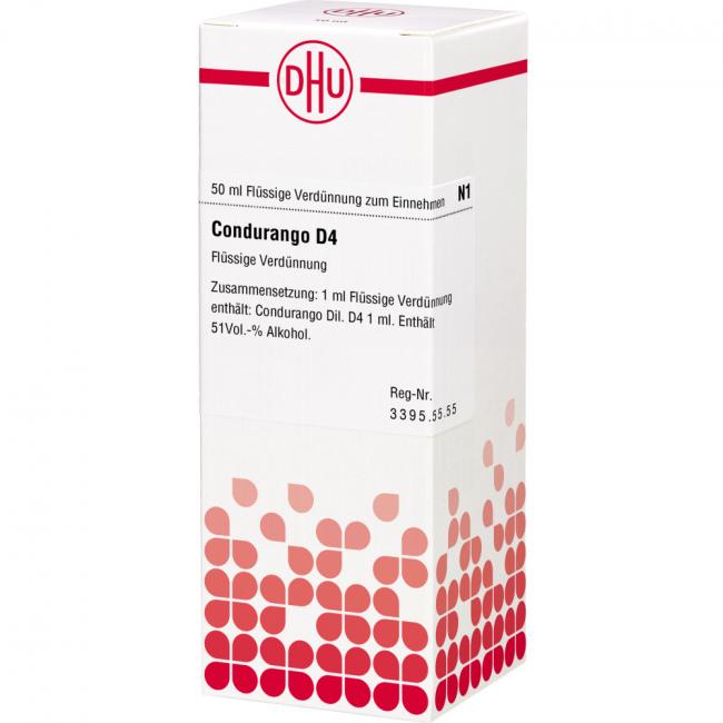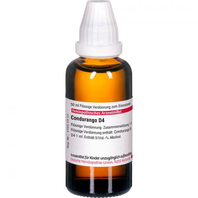Condurango D 4. Anwendungsgebiete: Registriertes homöopathisches Arzneimittel, daher ohne Angabe einer therapeutischen Indikation. Warnhinweis: Enthält 51 Vol.% Alkohol.