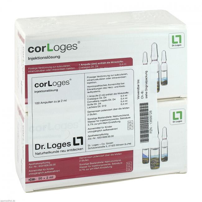 corLoges Injektionslösung, Flüssige Verdünnung zur Injektion. Anwendungsgebiete: Die Anwendungsgebiete leiten sich von den homöopathischen Arzneimittelbildern ab. Dazu gehört: Begleittherapie bei Herzschwäche.