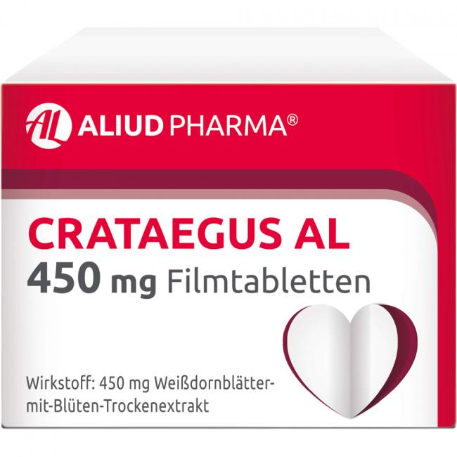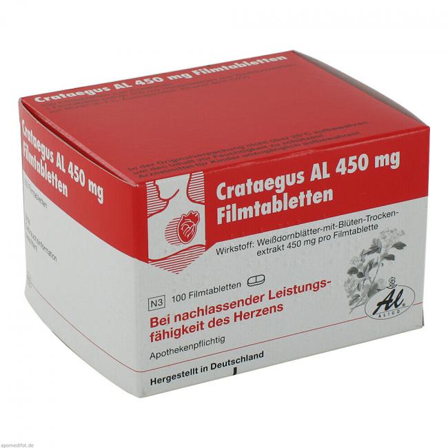 Crataegus AL 450 mg Filmtabletten. Wirkstoff: Weißdornblätter-mit-Blüten-Trockenextrakt 450 mg pro Filmtablette. Anwendungsgebiete: bei nachlassender Leistungsfähigkeit des Herzens entsprechend Stadium II nach NYHA.