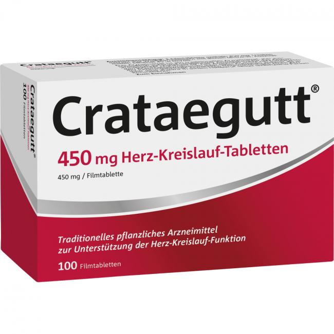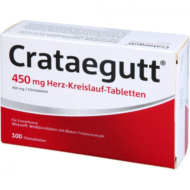 Crataegutt 450 mg Herz-Kreislauf-Tabletten 450 mg, Filmtabletten. Wirkstoff: Weißdornblätter-mit-Blüten-Trockenextrakt. Anwendungsgebiete: zur Unterstützung der Herz-Kreislauf-Funktion.