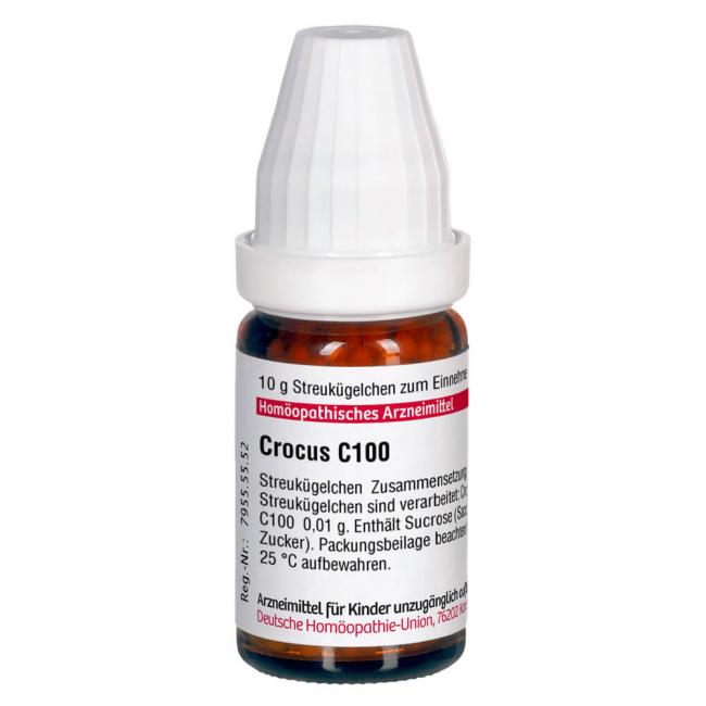 Crocus C 100. Anwendungsgebiete: Registriertes homöopathisches Arzneimittel, daher ohne Angabe einer therapeutischen Indikation. Warnhinweis: Dieses Arzneimittel enthält Sucrose (Saccharose / Zucker).