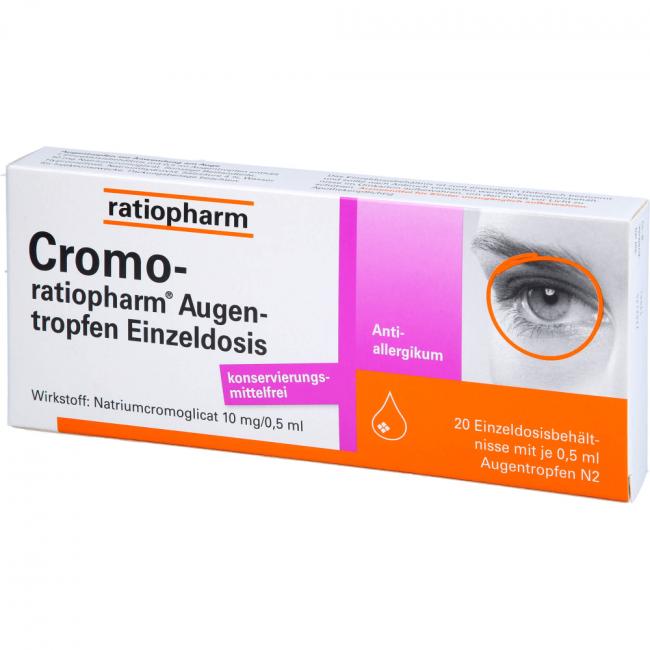 Cromo-ratiopharm Augentropfen. Wirkstoff: Natriumcromoglicat. Anwendungsgebiete: bei allergisch bedingter, akuter und chronischer Bindehautentzündung (Konjunktivitis), z.B. Heuschnupfen-Bindehautentzündung, Frühlingskatarrh ([Kerato-]Konjunktivitis vernalis). Warnhinweis: Enthält Benzalkoniumchlorid!