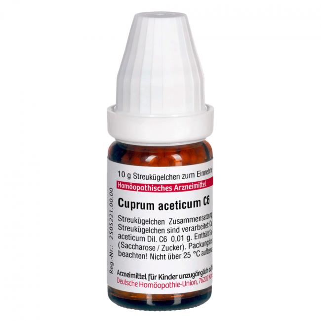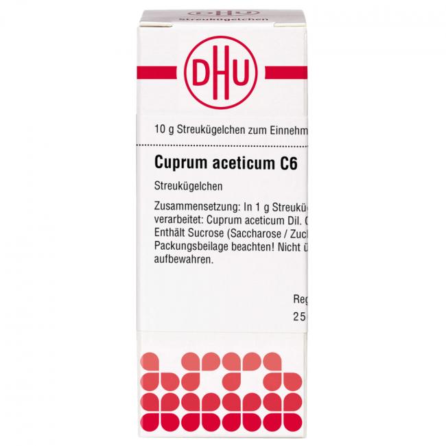 Cuprum aceticum C 6. Anwendungsgebiete: Registriertes homöopathisches Arzneimittel, daher ohne Angabe einer therapeutischen Indikation. Warnhinweis: Dieses Arzneimittel enthält Sucrose (Saccharose / Zucker).