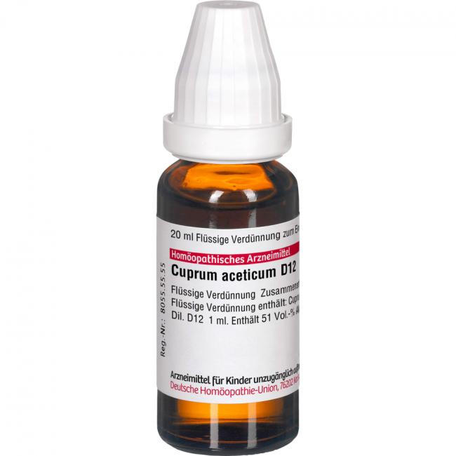 Cuprum Aceticum D 12. Anwendungsgebiete: Registriertes homöopathisches Arzneimittel, daher ohne Angabe einer therapeutischen Indikation. Warnhinweis: Enthält 51 Vol.% Alkohol.