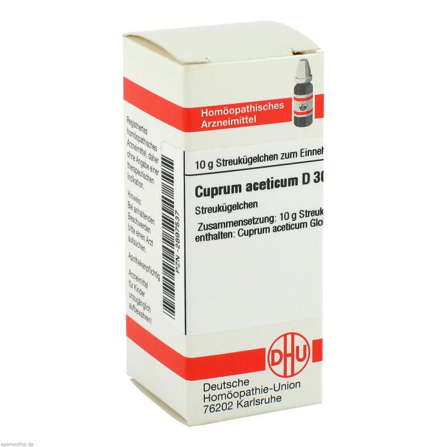 Cuprum Aceticum D 30. Anwendungsgebiete: Registriertes homöopathisches Arzneimittel, daher ohne Angabe einer therapeutischen Indikation. Warnhinweis: Dieses Arzneimittel enthält Sucrose (Saccharose / Zucker).