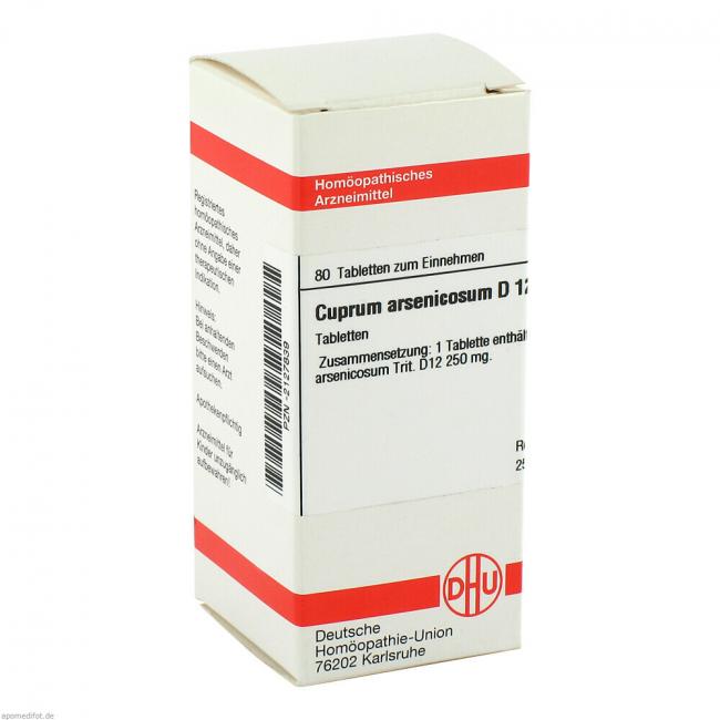 Cuprum Arsenicosum D 12. Anwendungsgebiete: Registriertes homöopathisches Arzneimittel daher ohne Angabe einer therapeutischen Indikation. Warnhinweis: Enthält Lactose (Milchzucker) und Weizenstärke.