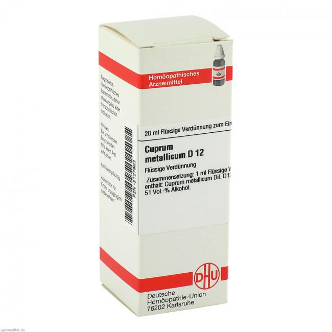 Cuprum Metallicum D 12. Anwendungsgebiete: Registriertes homöopathisches Arzneimittel, daher ohne Angabe einer therapeutischen Indikation. Warnhinweis: Enthält 51 Vol.% Alkohol.