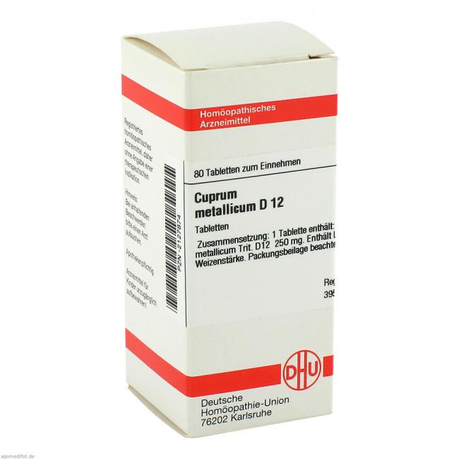 Cuprum Metallicum D 12. Anwendungsgebiete: Registriertes homöopathisches Arzneimittel daher ohne Angabe einer therapeutischen Indikation. Warnhinweis: Enthält Lactose (Milchzucker) und Weizenstärke.