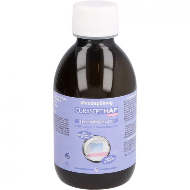 Starke Plaque-Ablagerungen, die beim Zähneputzen nicht entfernt werden, können die Ursache zahlreicher Zahn- und Zahnfleischprobleme sein. Daher wird die Anwendung der Mundspülung ergänzend zur regelmäßigen Mundpflege (Zähneputzen, Benutzung von Interdentalbürsten und Zahnseide) empfohlen, insbesondere bei Personen mit Zahnspangen, festen oder herausnehmbaren Zahnprothesen. Curasept HAP 020 mit dem ADS System hilft bei der täglichen Vorbeugung von Zahnfleischproblemen. HAP steht für Hyaluronsäure-Polymer (Hyaluronic Acid PVP-VA-Copolymer). Die Zahl 020 weist auf die PVP-VA-Konzentration von 0,20% hin. Ideal in Verbindung mit Curasept Zahnpasta.