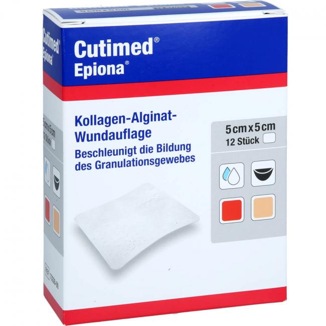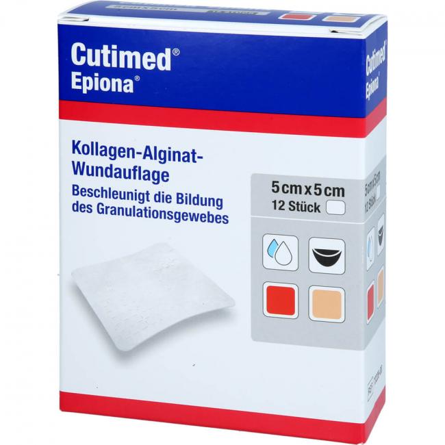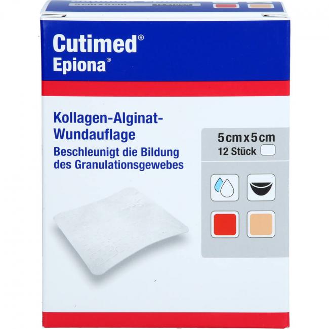 Cutimed Epiona ist ein aus 90% Kollagen und 10% Kalziumalginat bestehender, resorbierbarer Wundverband, der den Heilungsprozess chronischer und stagnierender Wunden (Problemwunden) managt und fördert ("Kick-Start"). Cutimed Epiona besteht zu 90% aus nativem Rinder-Kollagen, d.h. es besitzt einen ähnlichen strukturellen Aufbau wie die menschliche Dermis. Die Kollagenfasern sind in einer 3D Matrix Struktur angeordnet. Natives Kollagen kann dadurch übergangsweise die natürlichen Funktionen des in der chronischen Wunde defekten Kollagens wie die Förderung des Zellwachstums und die Gerüstfunktion zum Einwandern der Fibroblasten übernehmen. Darüber hinaus bindet Cutimed Epiona Faktoren, die sich negativ auf die Wundheilung auswirken (z.B. MMPs)2, wodurch Wachstumsfaktoren geschützt und das körpereigene Kollagen in seinem Aufbau nicht mehr gestört wird. Auf diese Weise managt und fördert Cutimed Epiona den Heilungsprozess chronischer oder stagnierender Wunden. Zusätzlich enthält Cutimed Epiona 10% Kalziumalginat, wodurch sich der Verband bei Exsudataufnahme in ein flexibles feuchtes Gel verwandelt. Auf diese Weise werden eine ideal-feuchte Wundumgebung und optimierte Heilungsbedingungen geschaffen. Der Verband wird in der Wunde resorbiert. Mögliche Reste können mit einer Wundspüllösung ausgespült werden.