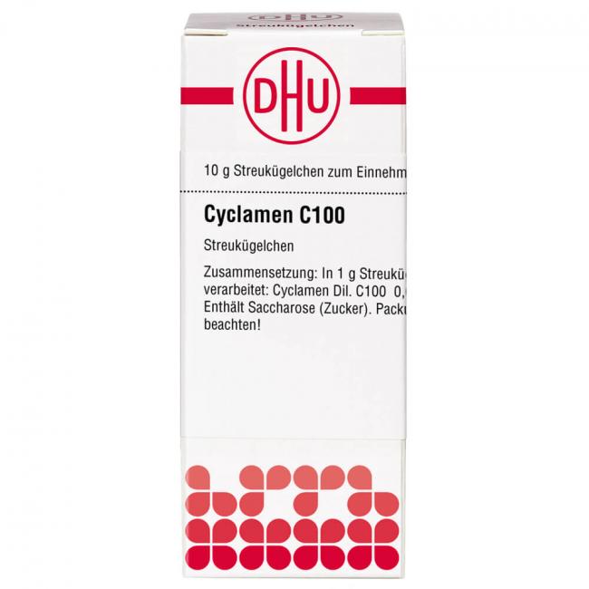 Cyclamen C 100. Anwendungsgebiete: Registriertes homöopathisches Arzneimittel, daher ohne Angabe einer therapeutischen Indikation. Warnhinweis: Dieses Arzneimittel enthält Sucrose (Saccharose / Zucker).