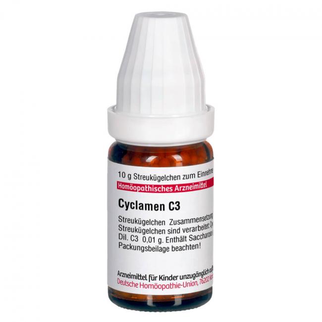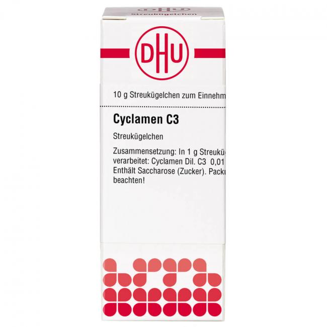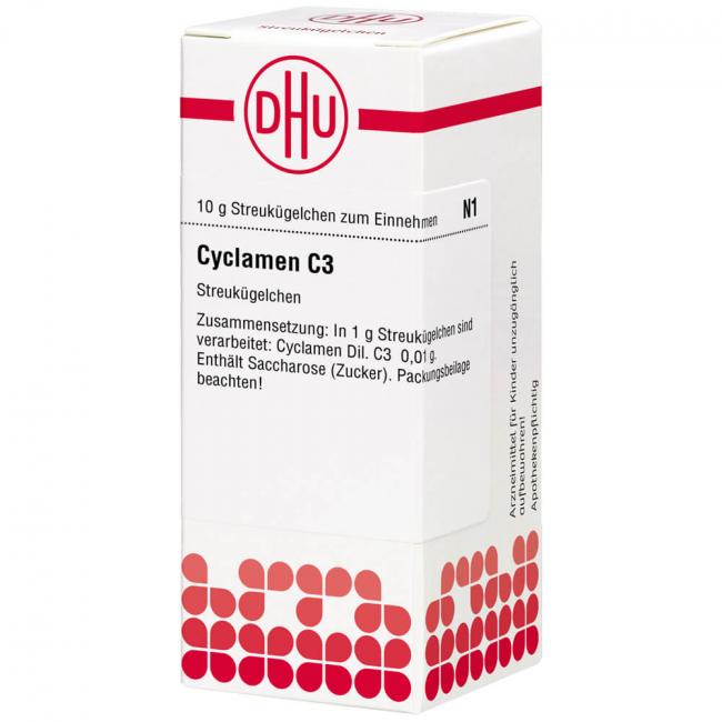 Cyclamen C 3. Anwendungsgebiete: Registriertes homöopathisches Arzneimittel, daher ohne Angabe einer therapeutischen Indikation. Warnhinweis: Dieses Arzneimittel enthält Sucrose (Saccharose / Zucker).