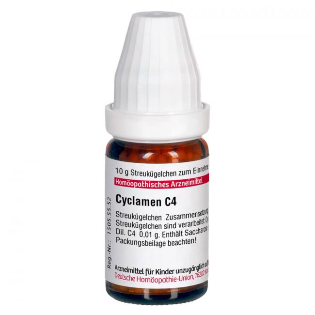 Cyclamen C 4. Anwendungsgebiete: Registriertes homöopathisches Arzneimittel, daher ohne Angabe einer therapeutischen Indikation. Warnhinweis: Dieses Arzneimittel enthält Sucrose (Saccharose / Zucker).