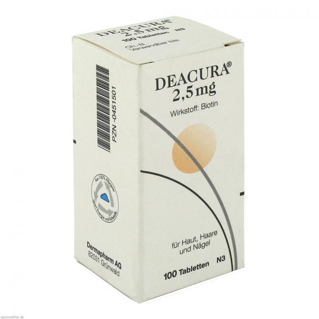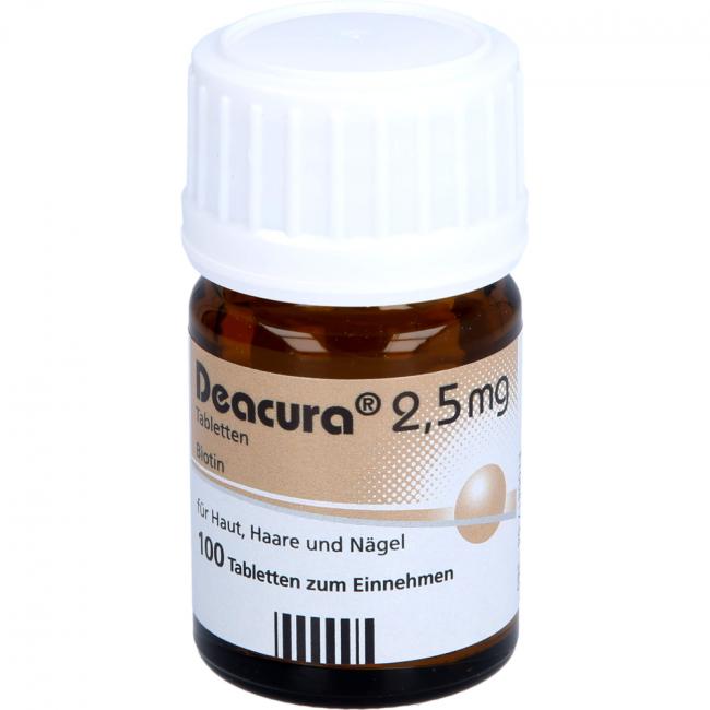 Deacura 2,5 mg ist ein Vitaminpräparat. Deacura 2,5 mg wird angewendet zur Vorbeugung und Behandlung eines Biotin Mangels. (Zur Vorbeugung sind weniger als