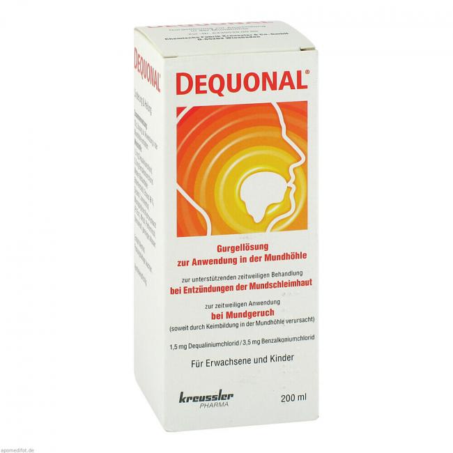 Dequonal 1,5/ 3,5 mg, Lösung. Anwendungsgebiete: zur unterstützenden zeitweiligen Behandlung bei Entzündungen der Mundschleimhaut und zur zeitweiligen Anwendung bei Mundgeruch (soweit durch Keimbildung in der Mundhöhle verursacht). Warnhinweis: Enthält 6 Vol.-% Alkohol!