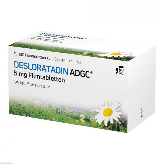 Desloratadin ADGC 5 mg Filmtabletten. Wirkstoff: Desloratadin. Anwendungsgebiete: bessert die Symptome bei allergischer Rhinitis (durch eine Allergie hervorgerufene Entzündung der Nasengänge, beispielsweise Heuschnupfen oder Hausstaubmilben-Allergie) bei Erwachsenen und Jugendlichen ab 12 Jahren; Linderung der Symptome einer Urtikaria (durch eine Allergie hervorgerufener Hautzustand).