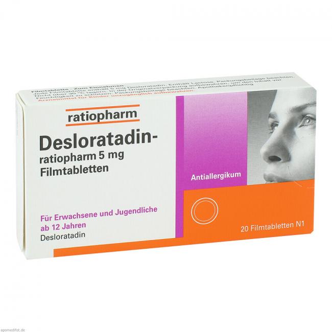 Desloratadin-ratiopharm 5 mg Filmtabletten. Wirkstoff: Desloratadin. Anwendungsgebiete: bessert die Symptome bei allergischer Rhinitis (durch eine Allergie hervorgerufenen Entzündung der Nasengänge, beispielsweise Heuschnupfen oder Hausstaubmilben-Allergie) bei Erwachsenen und Jugendlichen ab 12 Jahren. Warnhinweis: Enthält Lactose.