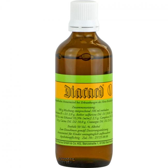 Diacard Mischung. Anwendungsgebiete: Die Anwendungsgebiete leiten sich von den homöopathischen Arzneimittelbildern ab. Dazu gehören: funktionelle Herzbeschwerden bei allgemeiner vegetativer Labilität. Warnhinweis: Enthält 50 Vol.-% Alkohol!