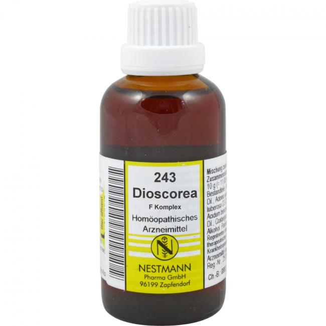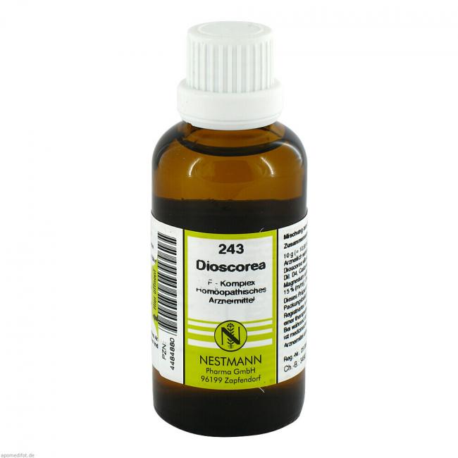 Nestmann 243 Dioscorea F Komplex, Mischung. Anwendungsgebiete: Registriertes homöopathisches Arzneimittel, daher ohne Angabe einer therapeutischen Indikation. Warnhinweis: Enthält 58,9 Vol.-% Alkohol!