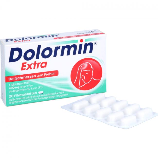 Dolormin Extra sind weiße, kapselförmige Filmtabletten mit Bruchkerbe und eingeprägtem "D" auf jeder Tablettenseite und -hälfte. Die Filmtabletten sind ca. 19 mm lang. Die Tablette kann in gleiche Dosen geteilt werden. Dolormin Extra ist in Blisterpackungen mit 10, 15, 20, 30, 40 und 50 Filmtabletten erhältlich. Es werden möglicherweise nicht alle Packungsgrößen in den Verkehr gebracht.