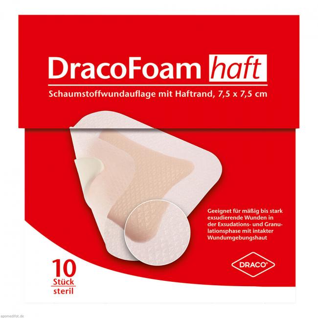 DracoFoam haft ist eine stark absorbierende Schaumstoffwundauflage für mittel bis stark exsudierende, chronische und akute Problemwunden mit intakter Wundumgebungshaut. DracoFoam haft gewährleistet hohe Exsudataufnahme und Abdampfrate. Die Schaumstoffwundauflage gewährleistet atraumatischen Verbandwechsel und verhindert das Einsprießen des Gewebes in die Wundauflage. Patientenverträglichkeit wird durch minimiertes Allergiepotential des klebstofffreien Wundkissens aus feinporigem Polyurethanschaum sowie dem hautfreundlichen Acrylatkleber des umlaufenden Haftrands gewährleistet. DracoFoam haft ist durchlässig für Gase, duschfest und bietet sicheren Wäscheschutz. DracoFoam haft kann bei akuten und chronischen, mäßig bis stark exsudierenden Wunden in der Exsudations- und Granulationsphase wie auch bei oberflächlichen Wunden, bei Ulcus cruris venosum und arteriosum, Dekubitus, Diabetischem Fuß, Verbrennungen 2. Grades sowie Spalthautentnahmen angewendet werden. Auch unter Kompressionstherapie kann die Wundauflage verwendet werden.
