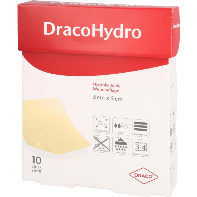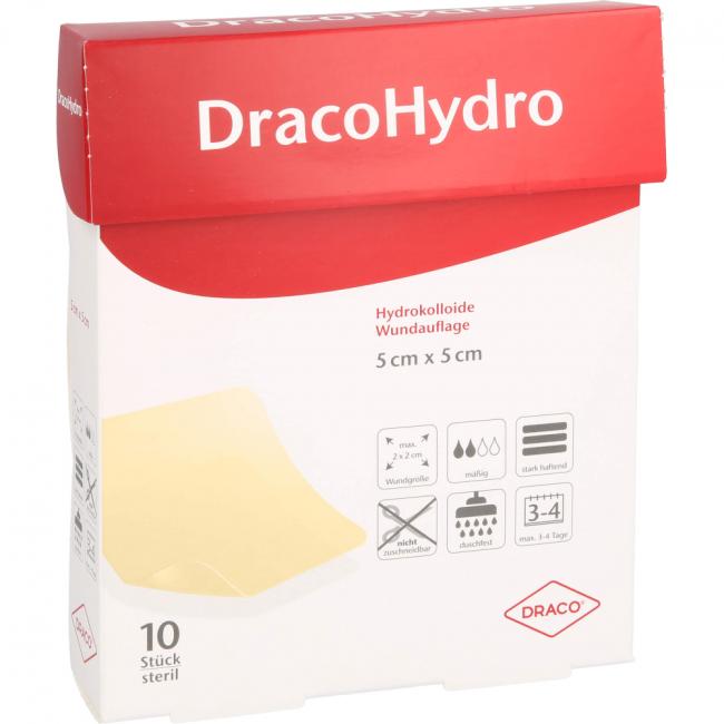 DracoHydro ist eine sterile, hydrokolloide Wundauflage. Hydrokolloide Wundverbände (HCV) fördern die Granulation und das autolytische Debridement chronischer und akuter Problemwunden. Die Hydrokolloid-Wundauflage schafft ein idealfeuchtes Wundmilieu und optimale Heilungsbedingungen. Die Wundauflage eignet sich für mäßig bis gering exsudierende, nicht infizierte Wunden und bindet Exsudat, Zelltrümmer und Keime sicher im Hydrokolloid. DracoHydro bindet Exsudat, ohne mit der Wunde zu verkleben und ermöglicht so einen schmerzfreien, atraumatischen Verbandwechsel. DracoHydro ist wasserdicht und bakteriendicht. Ein Wechsel der Wundauflage ist erforderlich, wenn das Hydrokolloidkissen vollständig mit Exsudat vollgesogen ist oder die Gelblase sich über den Wundrand hinaus ausdehnt. Die Tragedauer kann abhängig vom Exsudataufkommen drei bis vier Tage betragen.