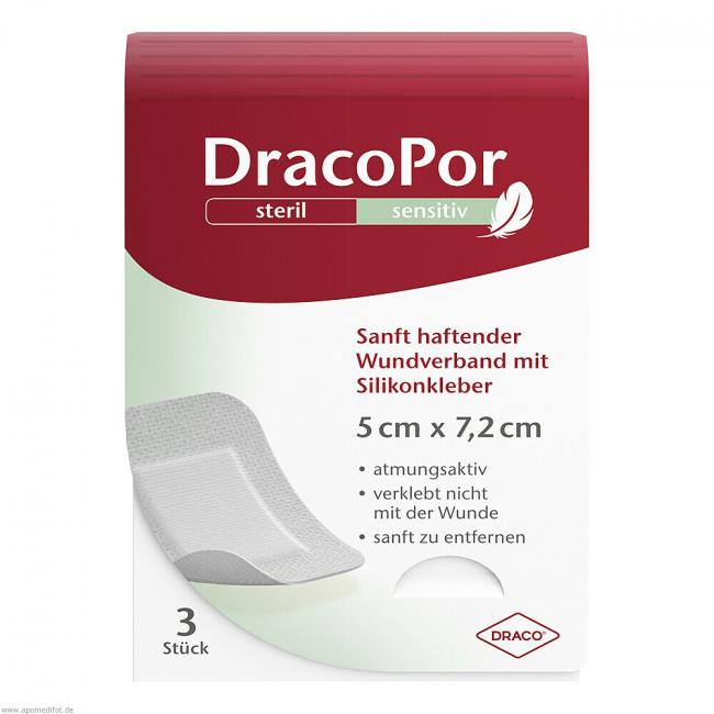 Pflichtangaben DRACOPOR sensitiv 5x7,2 cm steril m.Silikonkleber, 3 Stück
