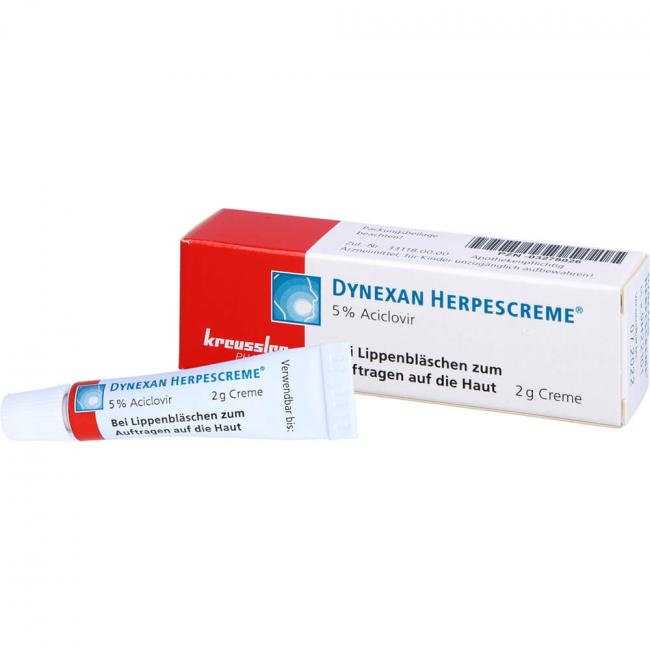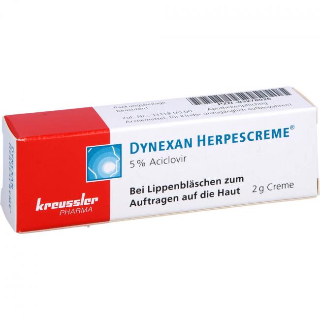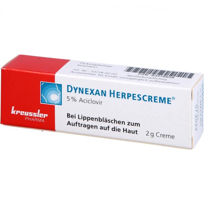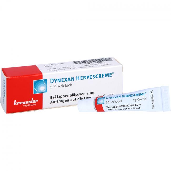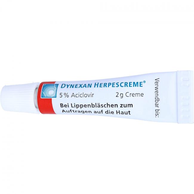 Dynexan Herpescreme. Wirkstoff: Aciclovir. Anwendungsgebiete: Zur lindernden Behandlung von Schmerzen und Juckreiz bei häufig wiederkehrenden Herpesinfektionen mit Bläschenbildung im Lippenbereich.